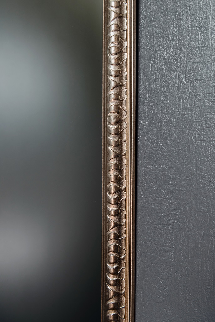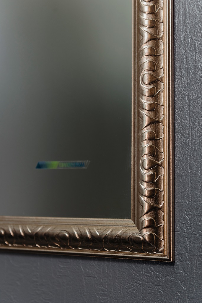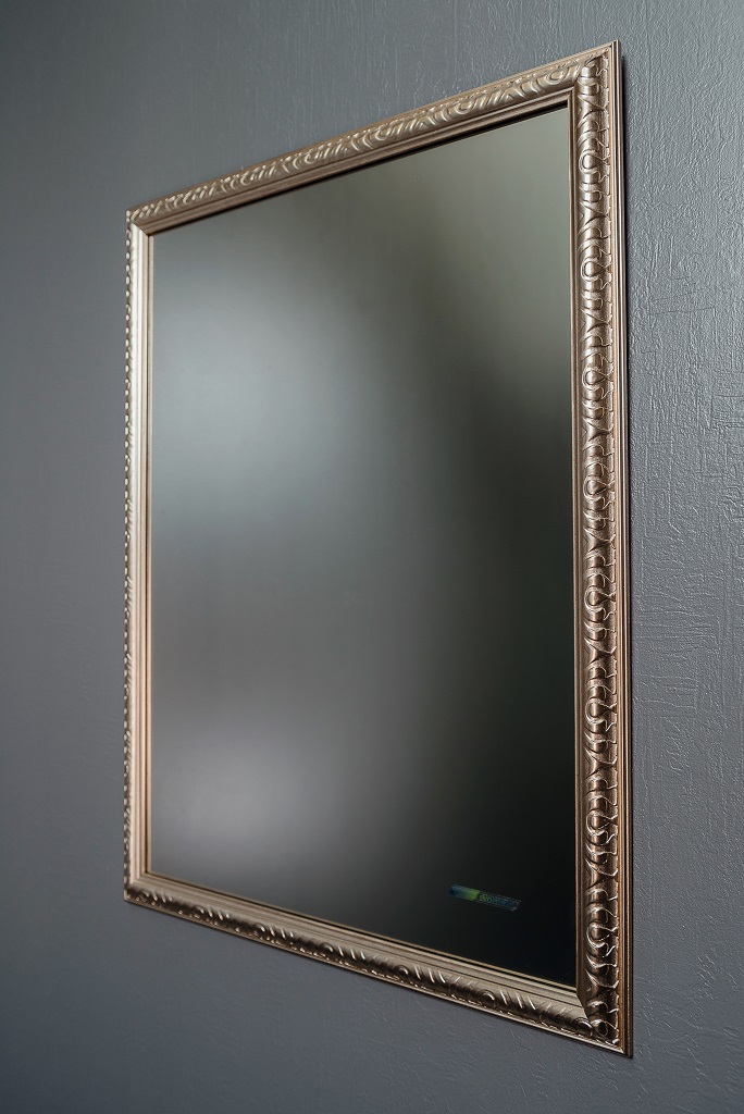 Modernus kvadratinis veidrodis su rėmu. Veidrodžio rėmas kvadrato formos. Rėmo plotis 41 mm, melchioro spalvos.  Veidrodis yra atsparus drėgmei tinka vonios kambariui. Šis veidrodis būtinai  papuoš, bet kurį kambarį Jūsų namuose. Veidrodžio rėmas pagamintas iš poliuretano dervos mases.