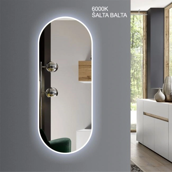Minimalist hanging oval mirror with LED lighting. The mirror is moisture-resistant and suitable for the bathroom. Most often hung in bathrooms with narrow sinks that require a small width. In addition, this model can be mounted in a horizontal position, which will be very important for bathrooms with double sinks.