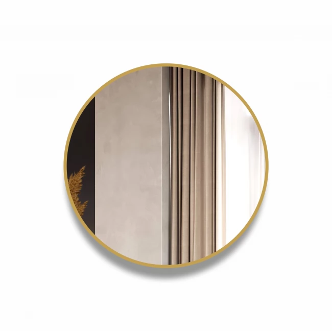 Minimalistinis pakabinamas apvalus veidrodis su matinio aukso spalvos rėmu. Veidrodis yra atsparus drėgmei, tinka vonios kambariui. Dažniausiai kabinamas vonios kambariuose su siauromis kriauklėmis, kurioms reikalingas nedidelis plotis.