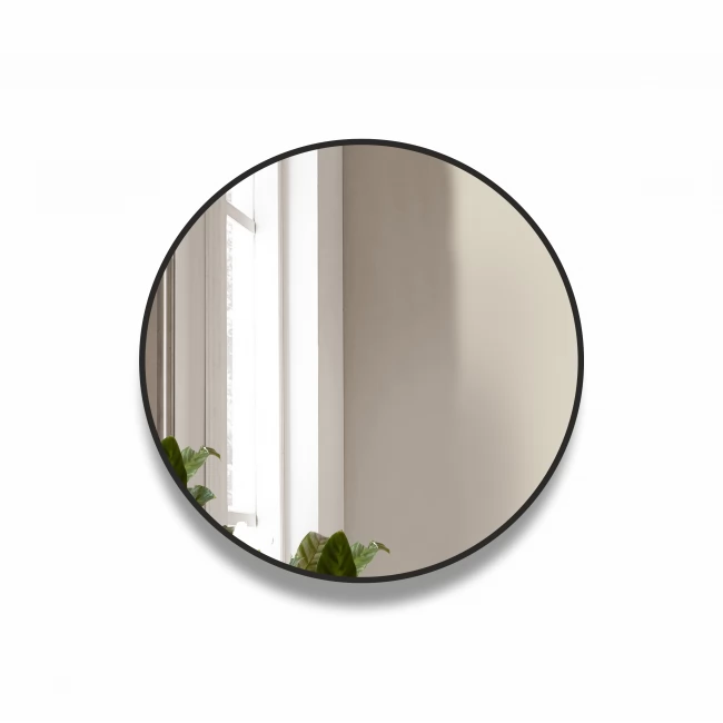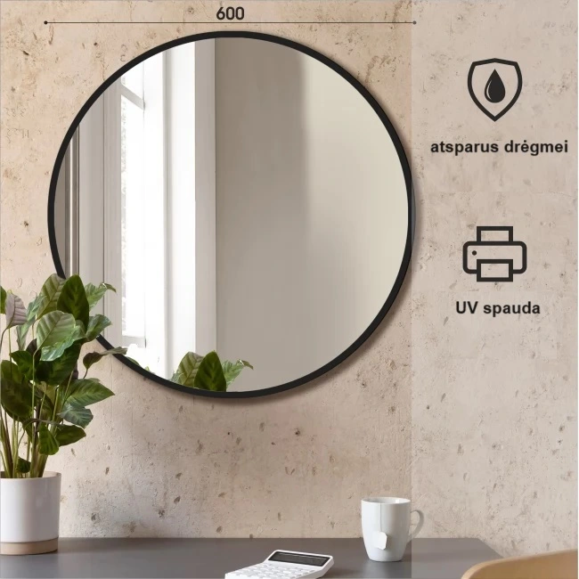Minimalistinis pakabinamas apvalus veidrodis su juodu rėmu. Veidrodis yra atsparus drėgmei, tinka vonios kambariui. Dažniausiai kabinamas vonios kambariuose su siauromis kriauklėmis, kurioms reikalingas nedidelis plotis.