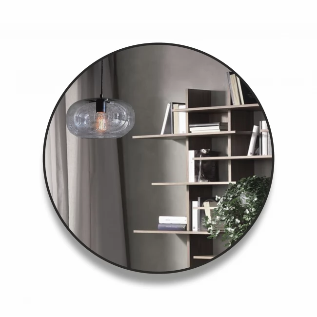 Minimalistinis pakabinamas apvalus veidrodis su juodu rėmu. Veidrodis yra atsparus drėgmei, tinka vonios kambariui. Dažniausiai kabinamas vonios kambariuose su siauromis kriauklėmis, kurioms reikalingas nedidelis plotis.
