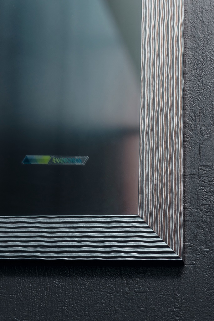 Modernus kvadratinis veidrodis su rėmu. Veidrodžio rėmas kvadrato formos. Rėmo plotis 46 mm, aliuminio spalvos.  Veidrodis yra atsparus drėgmei tinka vonios kambariui. Šis veidrodis būtinai  papuoš, bet kurį kambarį Jūsų namuose. Veidrodžio rėmas pagamintas iš poliuretano dervos mases.