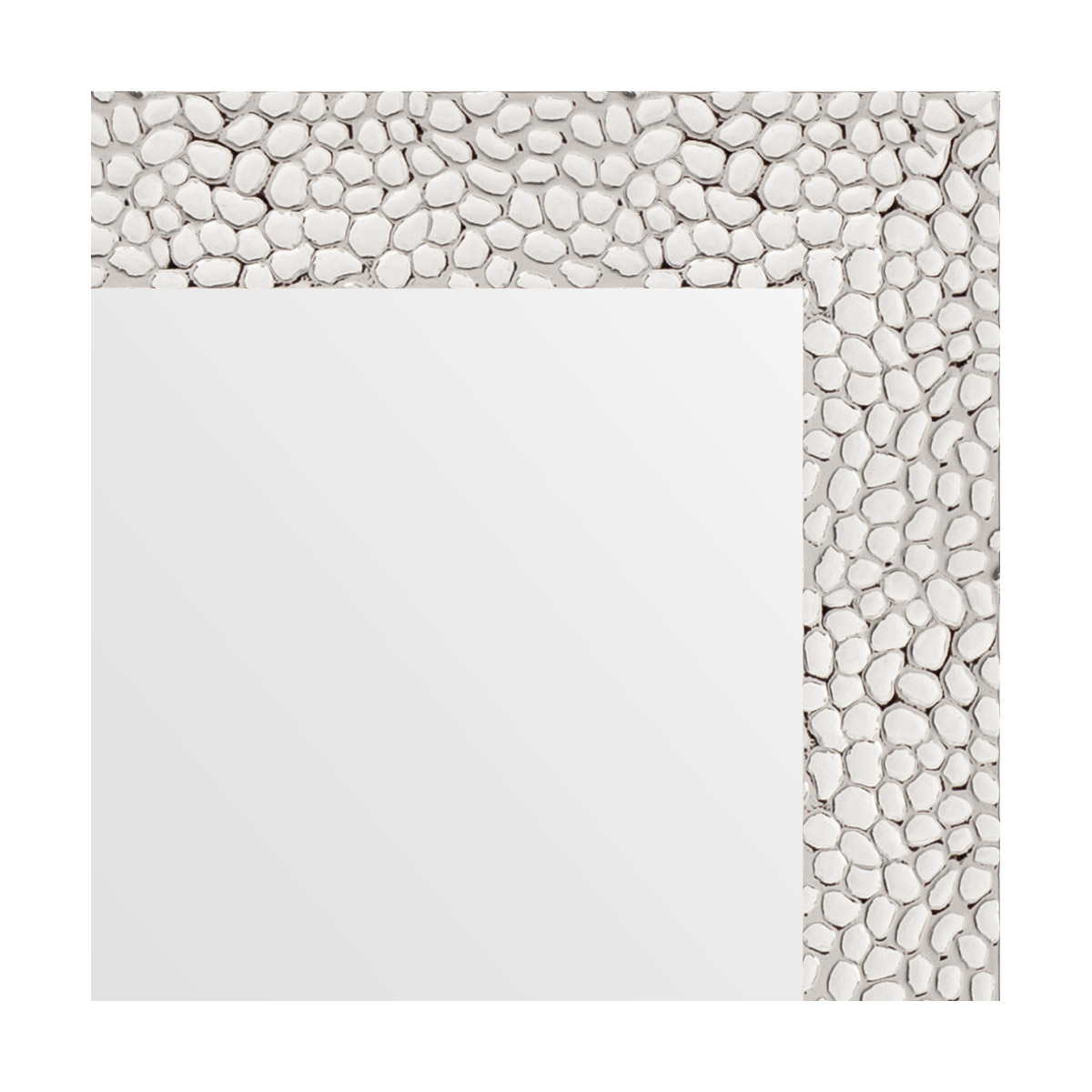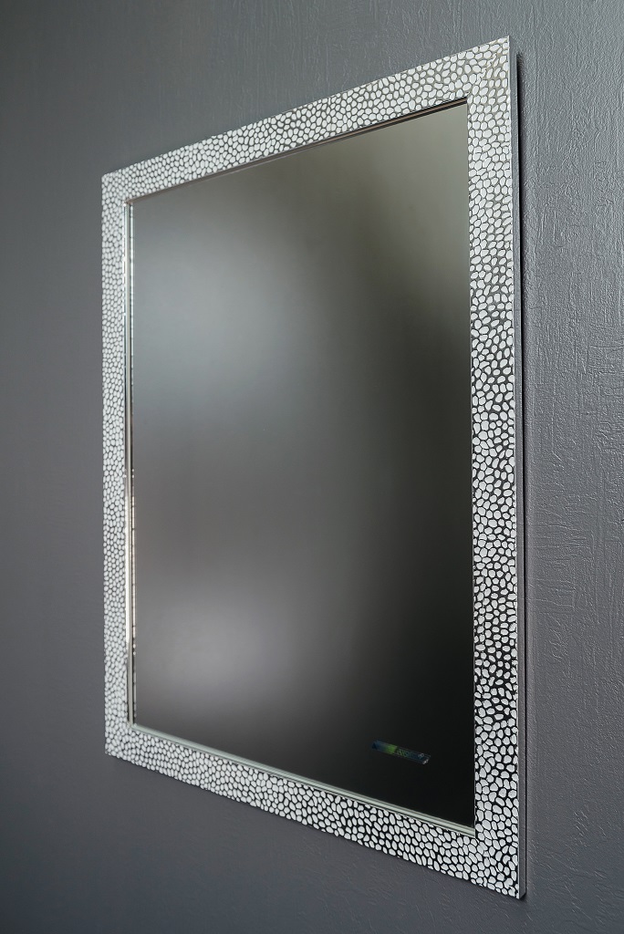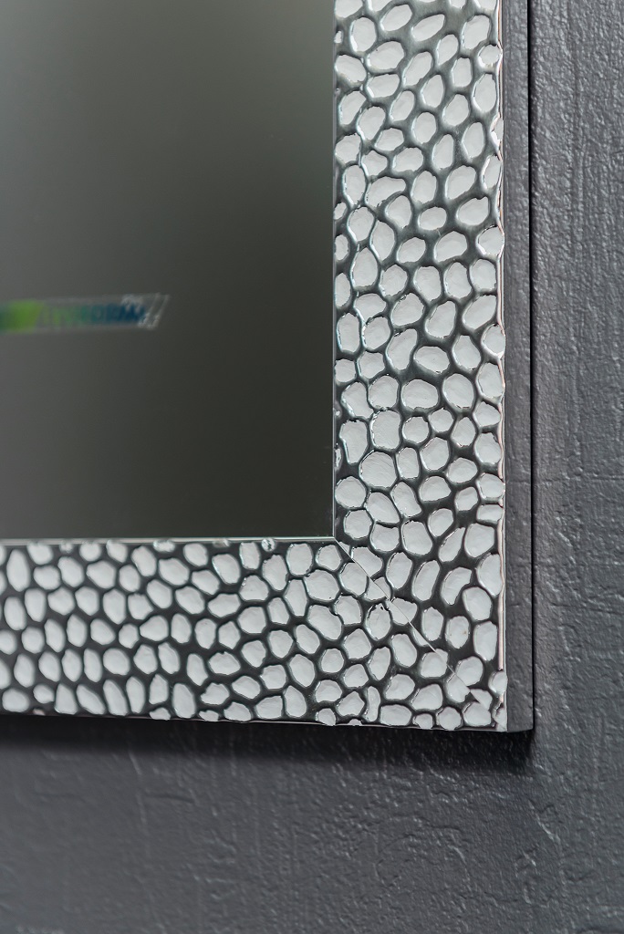 Modernus  veidrodis su rėmu. Veidrodžio rėmas stačiakampio  formos. Rėmo plotis 46 mm, aliuminio spalvos.  Veidrodis yra atsparus drėgmei tinka vonios kambariui. Šis veidrodis būtinai  papuoš, bet kurį kambarį Jūsų namuose. Veidrodžio rėmas pagamintas iš poliuretano.