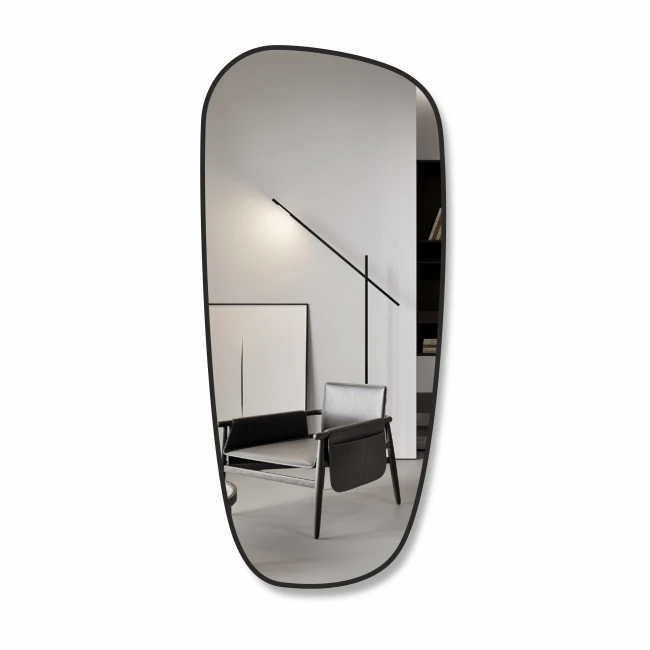 Netaisyklingos formos veidrodis su juodu rėmu 65×150 cm.