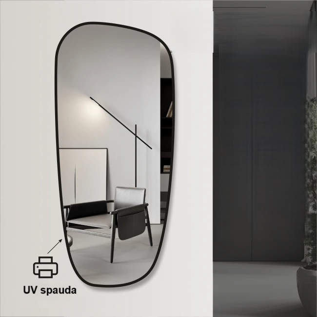 Veidrodžio rėmelis pagamintas naudojant UV spaudos technologiją – 10 mm pločio piešinys polimerizuojamas ultravioletiniais spinduliais, todėl paviršius yra matinis, atsparus drėgmei ir ilgaamžis. Idealiai tinka prieškambariui, vonios kambariui ar svetainei – vizualiai didina erdvę ir harmoningai dera su aplinka.