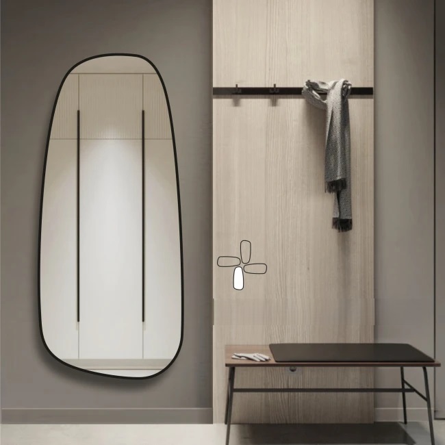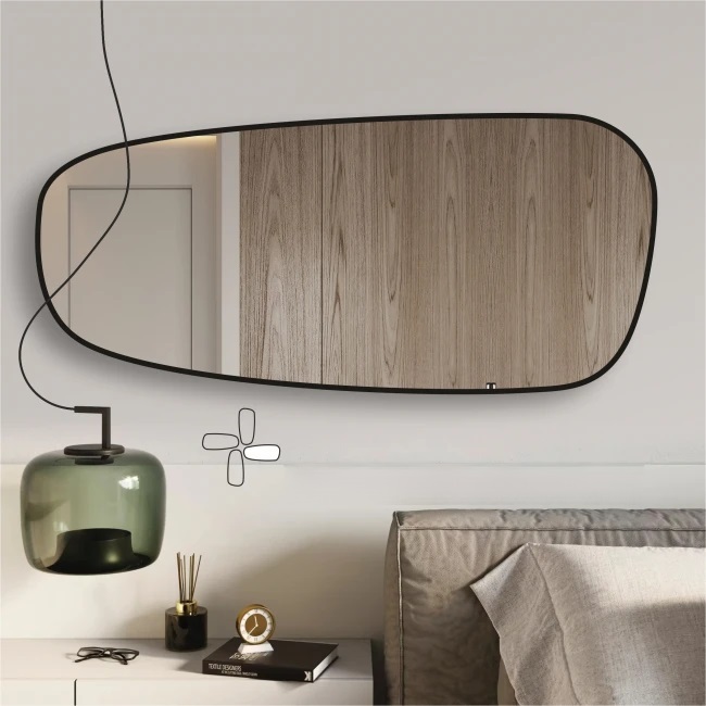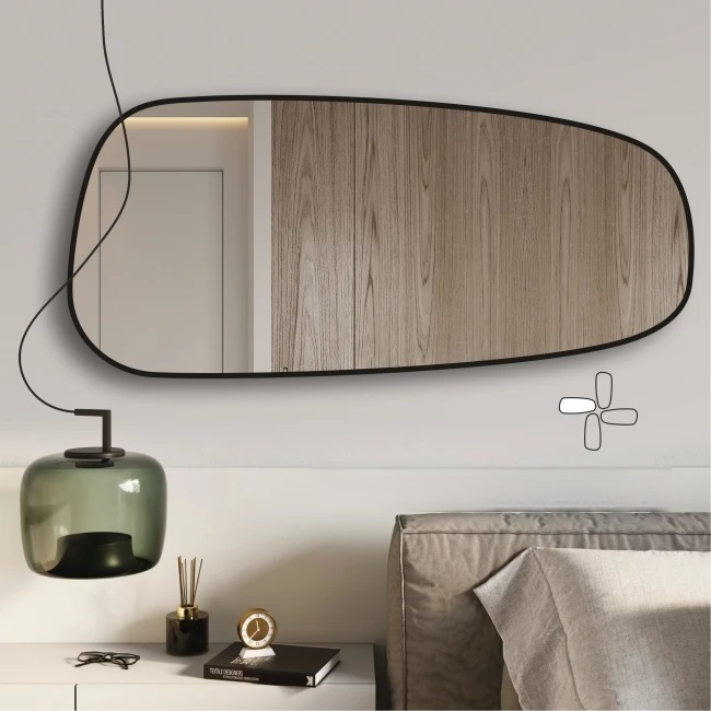 Pasirinkite šį išskirtinį, modernų netaisyklingos formos veidrodį su juodu rėmeliu ir paverskite savo namus stilinga bei funkcionalia erdve.
