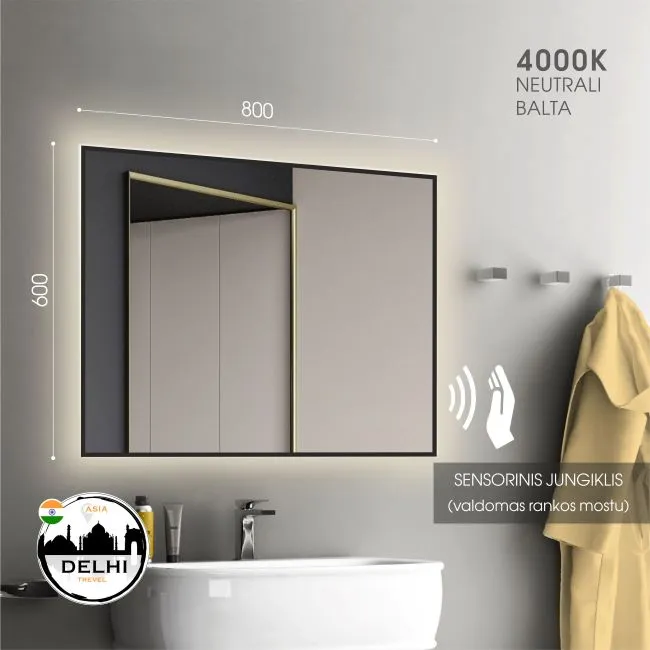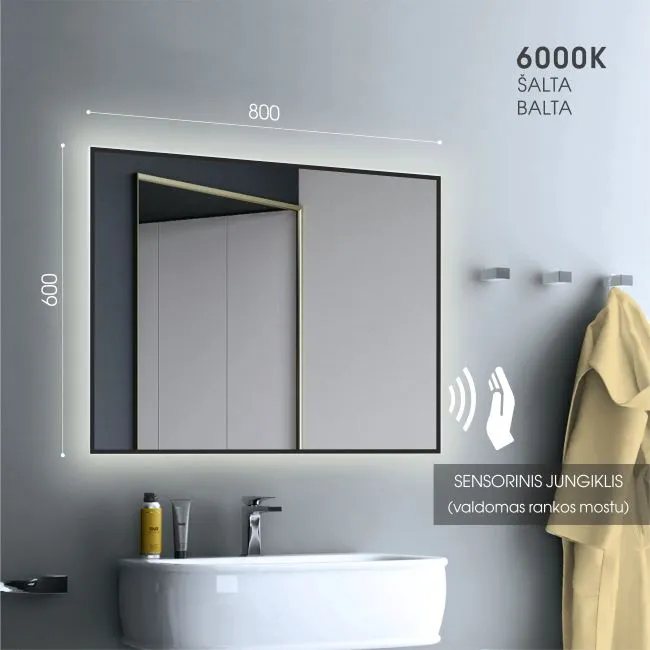 Modernus 80×60 cm vonios veidrodis su LED apšvietimu .