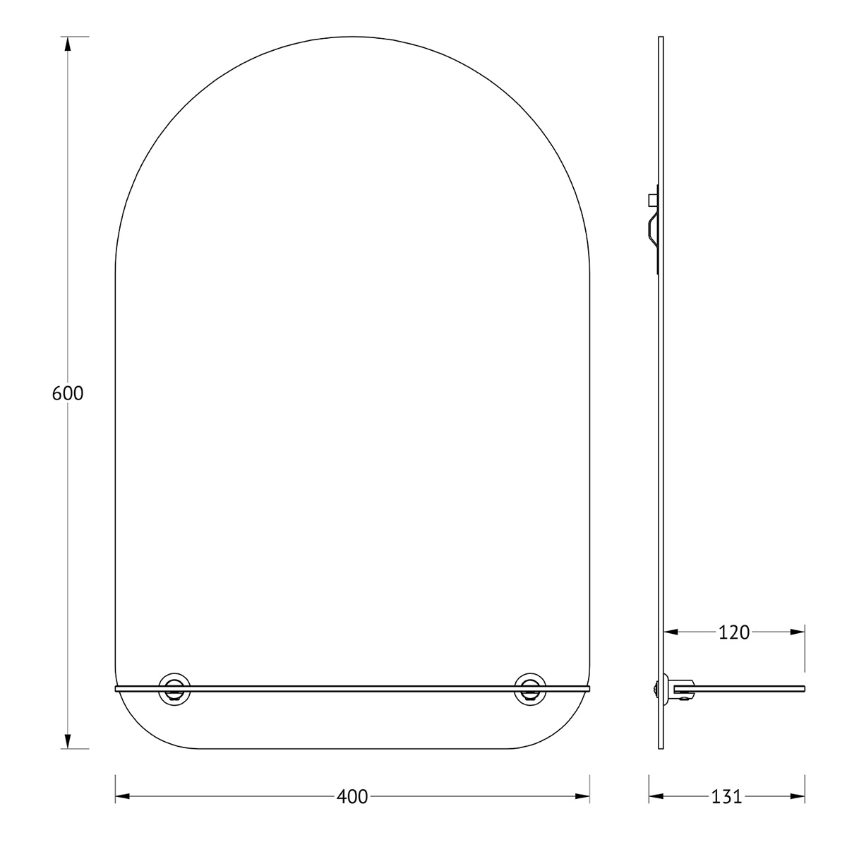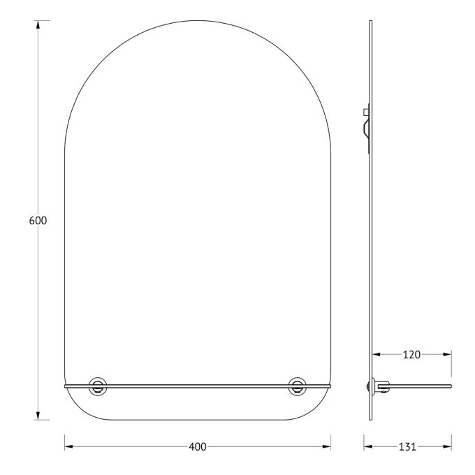Gražus sieninis veidrodis su lentynėle. Veidrodžio viršus užapvalintas. Veidrodis yra atsparus drėgmei, skirtas vonios kambariui. Veidrodis komplektuojamas su pakabinimo elementais ir matinio stiklo lentynėle.