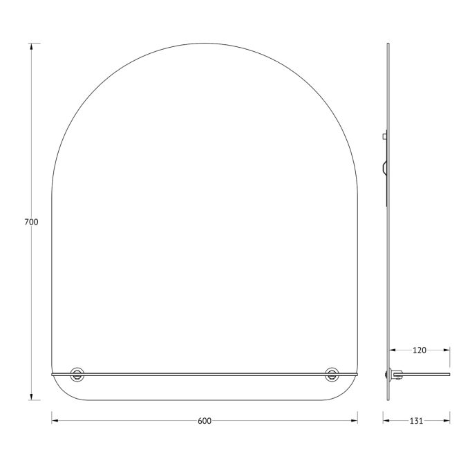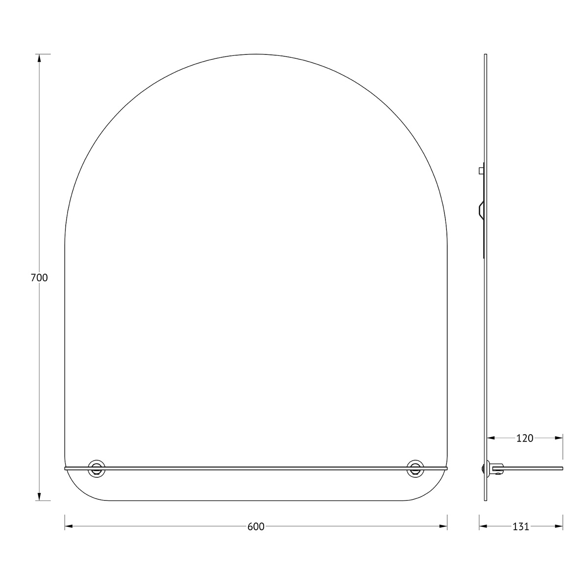 Gražus sieninis veidrodis su lentynėle. Veidrodžio viršus užapvalintas. Veidrodis yra atsparus drėgmei, skirtas vonios kambariui. Veidrodis komplektuojamas su pakabinimo elementais ir matinio stiklo lentynėle.