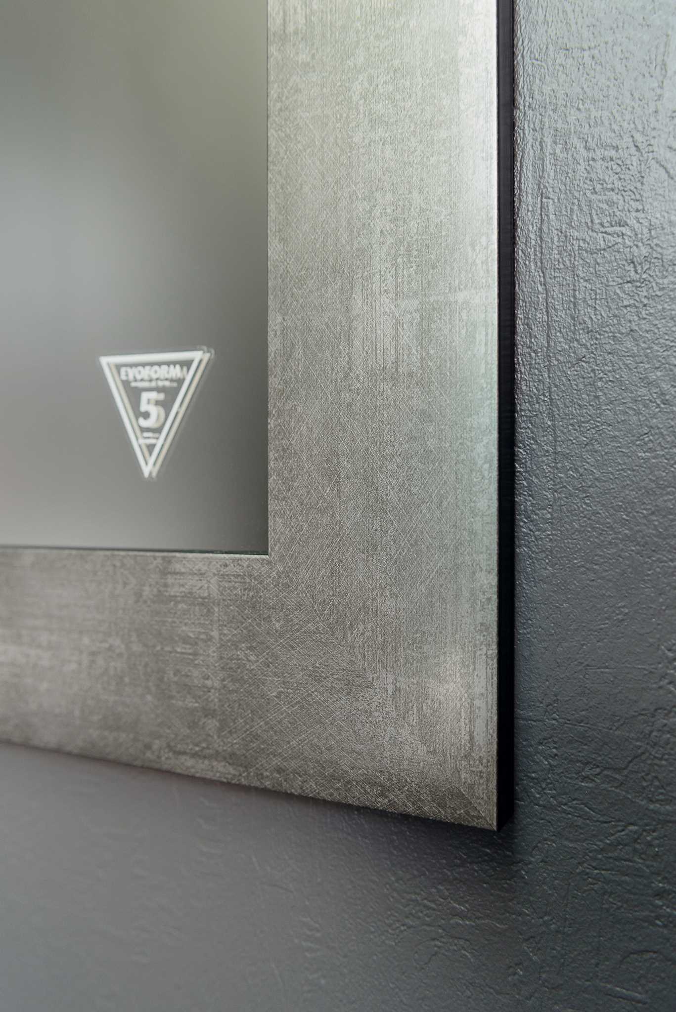 Labai gražus veidrodis su rėmu. Veidrodžio rėmas stačiakampio formos. Rėmo plotis 90 mm. Veidrodžio rėmas aliuminio spalvos. Veidrodis yra atsparus drėgmei tinka net vonios kambariui. Šis veidrodis būtinai papuoš, bet kurį kambarį Jūsų namuose. Veidrodžio rėmas pagamintas iš poliuretano dervos masės.