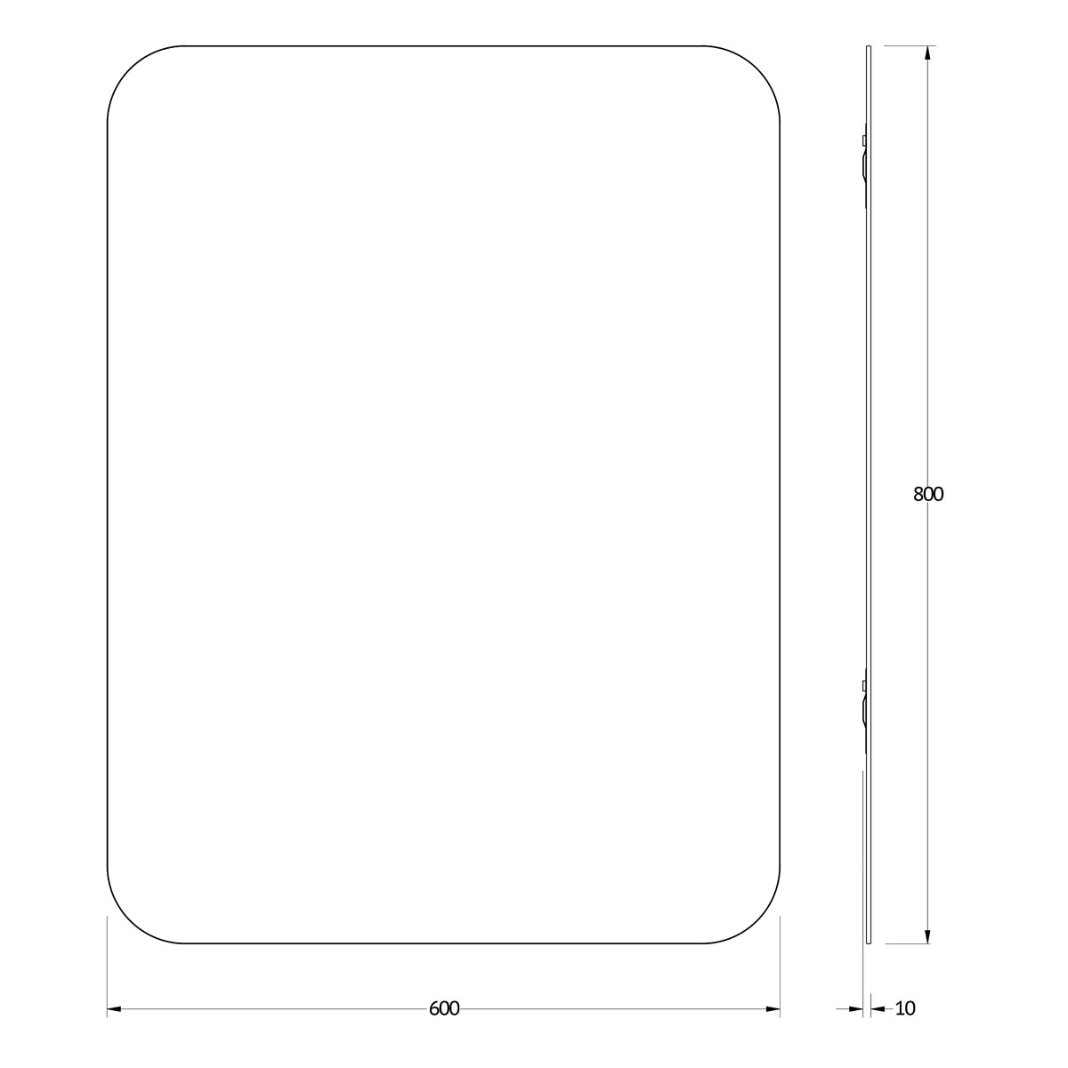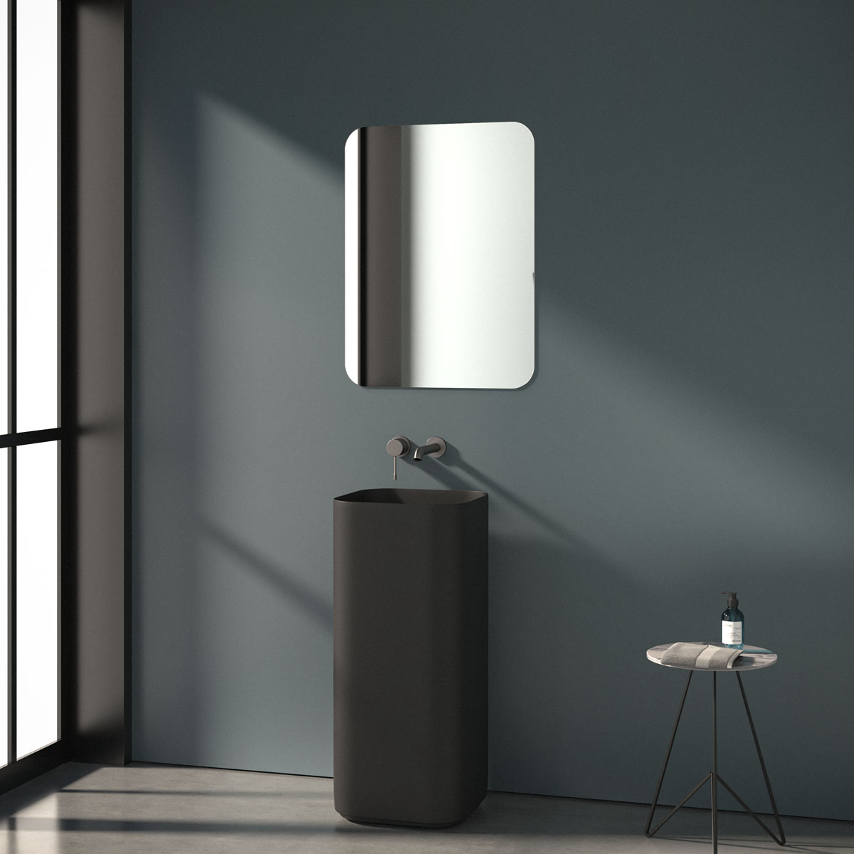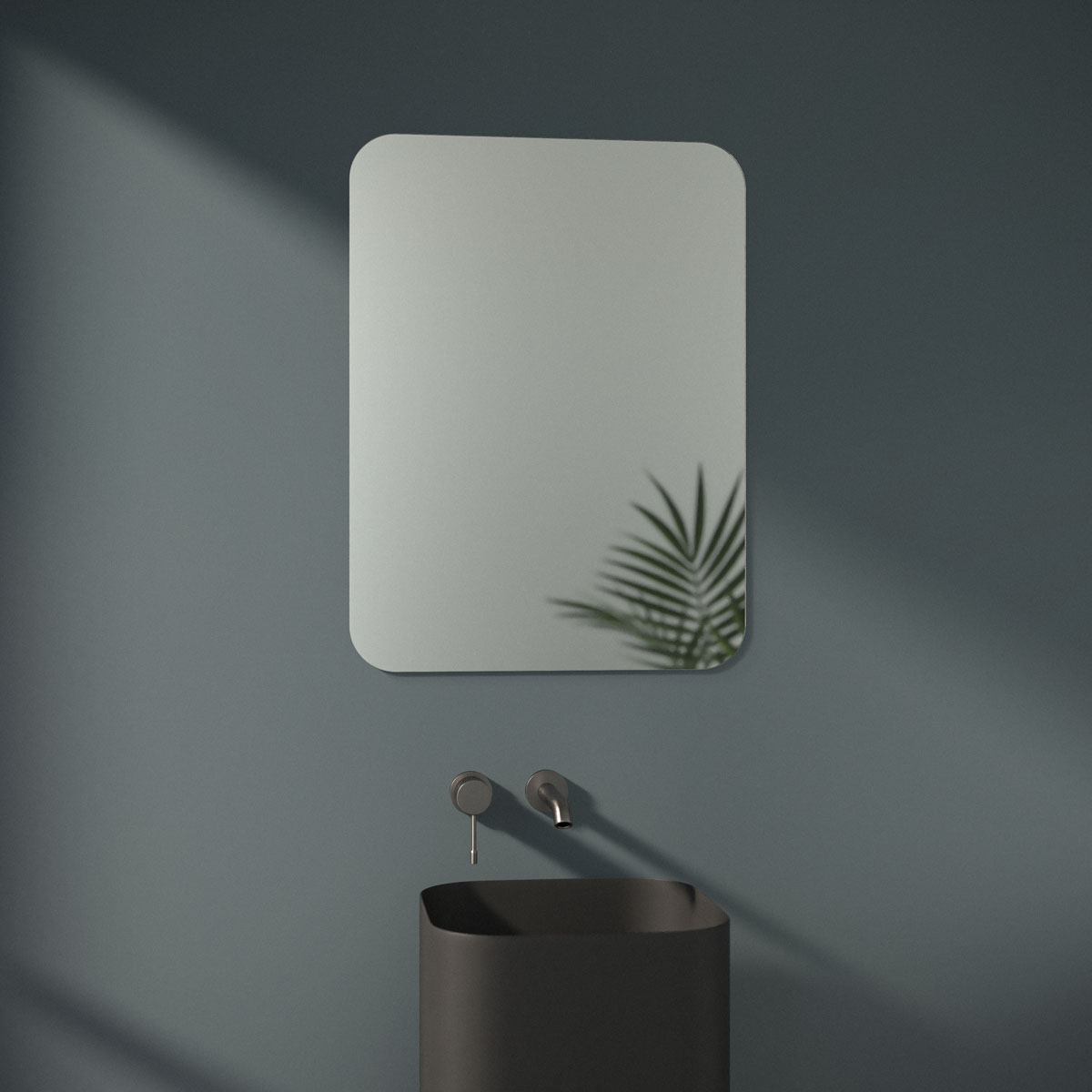 Gražus, modernus, pakabinamas veidrodis be rėmo. Veidrodis yra atsparus drėgmei tinka vonios kambariui.