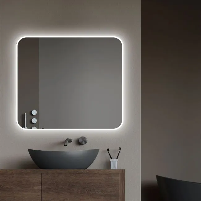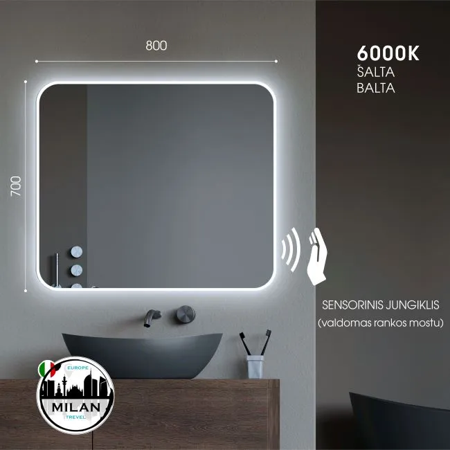 Modernus veidrodis užapvalintais kampais ir LED apšvietimu